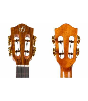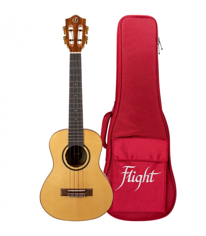 El ukelele concierto Sophia de Flight cuenta con una tapa de pícea sólida y aros y tapa trasera de nogal laminado. Además, el ukelele Sophia viene con cejuela y selleta de hueso, cuerdas de fluorocarbono Worth Brown y un clavijero único.